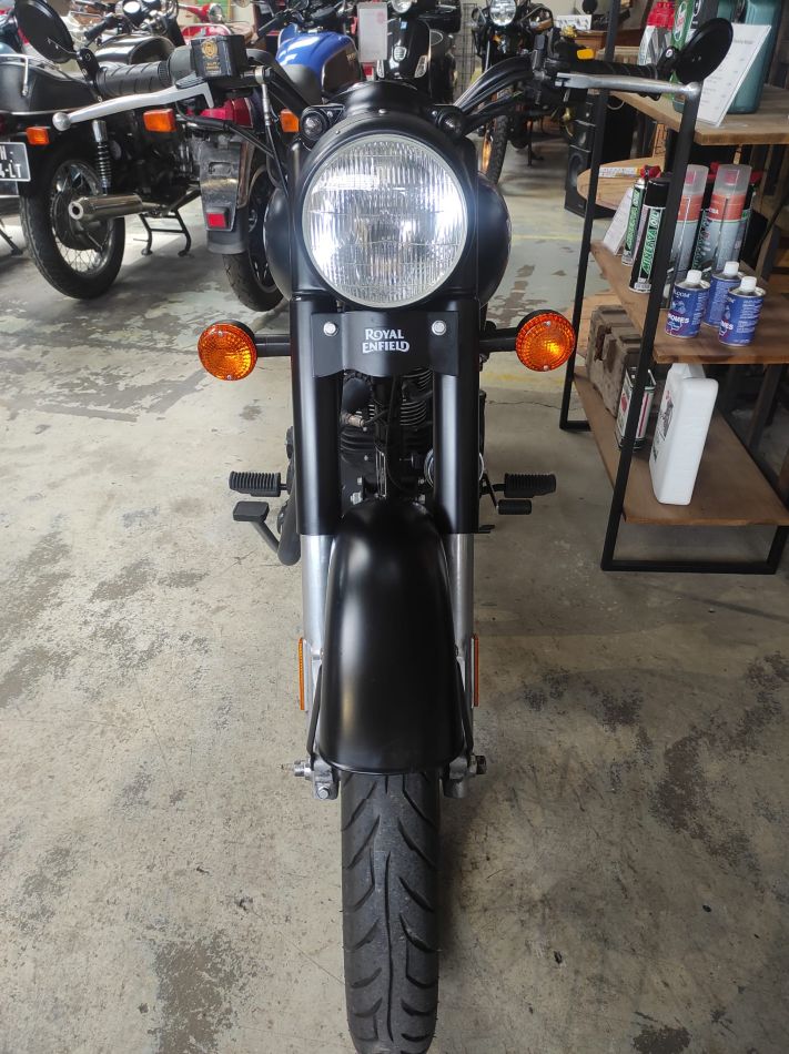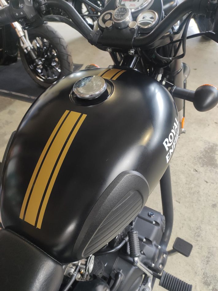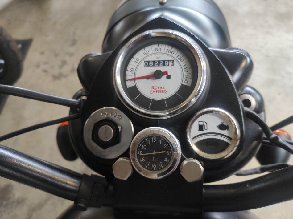 Elle est très propre, entretenue en concession Royal Enfield (facture et manuel utilisateur fournis). Rétroviseurs embouts de guidon. Double des clés. Colori Noir – Stealth Black